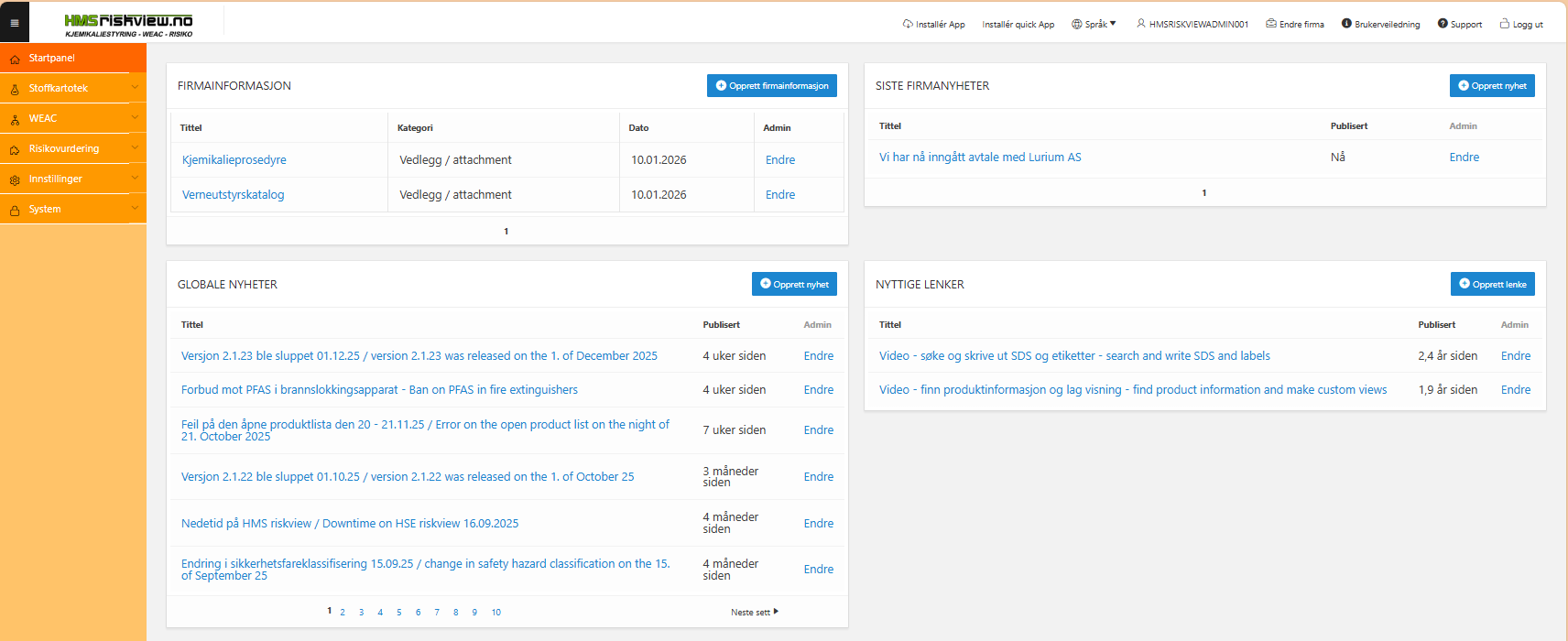 Det legges også ut informasjon fra HMS riskview, som for eksempel oppdateringer av applikasjonen og informasjon om relevante regelverksendringer.